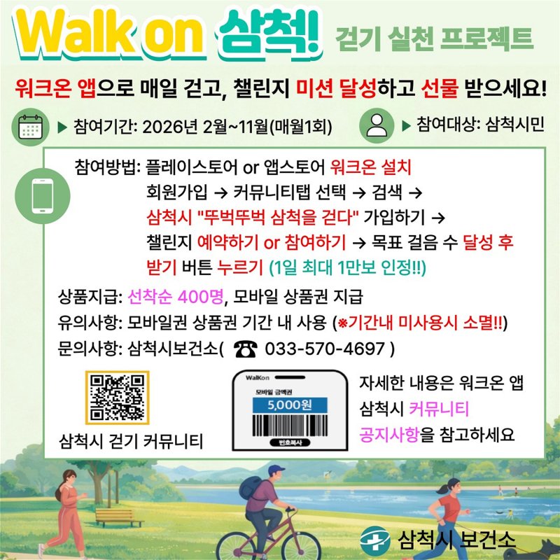 상세한 내용은 워크온 앱 내 삼척시 공식 커뮤니티 공지사항을 통해 확인할 수 있으며, 궁금한 사항은 삼척시 보건소로 문의하면 안내받을 수 있다.