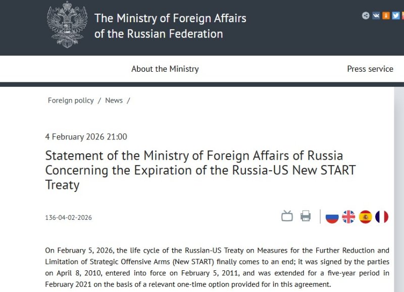 러시아 외무부는 이날 발표한 '뉴스타트 만료에 관한 성명'에서 "5일 뉴스타트 효력이 마침내 종료된다"며 "우리는 뉴스타트 당사국들이 조약의 핵심 조항을 포함해 조약 맥락에서 어떠한 의무나 대칭적 선언에도 더 이상 구속받지 않으며, 원칙적으로 다음 조치를 자유롭게 선택할 수 있다고 가정한다"고 했다.