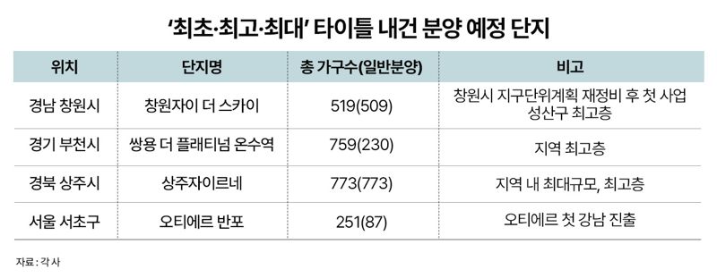 이밖에도 자이에스엔디가 같은 달 경북 상주시에서 ‘상주자이르네’를, 포스코이앤씨는 서울 서초구 잠원동 신반포21차 재건축 사업으로 ‘오티에르 반포’를 분양할 예정이다. 상주자이르네는 상주 지역 내 최대 규모이자 최고층 단지이며 오티에르 반포는 포스코이앤씨가 하이엔드 브랜드 ‘오티에르’를 강남권에 처음 적용한 단지다.
