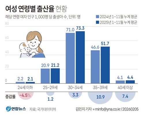 5일 국가데이터처에 따르면 30대 후반(35∼39세) 여성의 출산율(해당 연령 여자인구 1000명당 출생아 수)은 11개월 연속으로 전년 같은 달 대비 상승했다. 30대 후반 출산율은 지난해 1월에 전년보다 8.7명 상승한 것을 시작으로 가장 최근 통계가 나온 11월까지 줄곧 우상향 곡선을 그렸다. 1∼11월 평균 출산율은 2024년 46.6명에서 지난해 51.7명으로 올라가며 50명대에 진입했다.