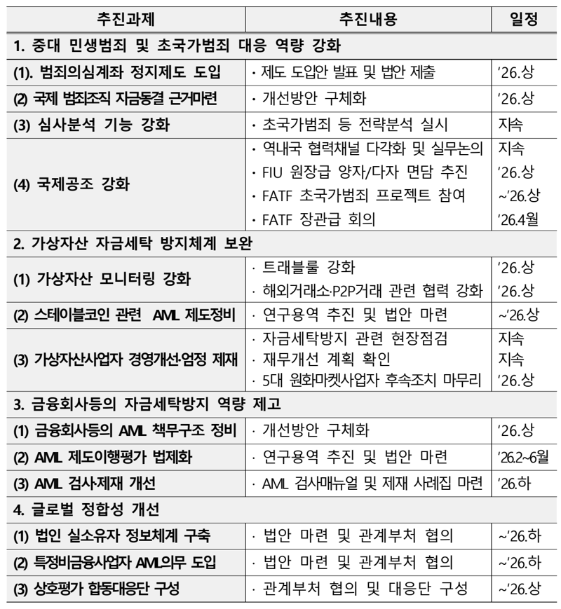 이번 계획은 특정금융정보법(특금법) 도입 25주년을 맞아 중대 민생 범죄 대응 역량 강화와 가상자산 자금세탁 방지체계 보완 등을 담고 있다.