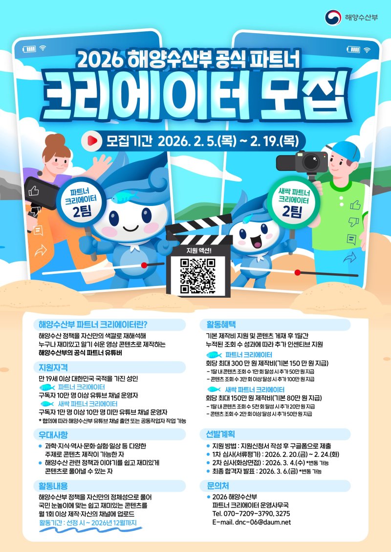 [서울=뉴시스] 박성환 기자 = 해양수산부는 오는 5일부터 19일까지 올 한 해 동안 해양수산 정책을 국민 눈높이에 맞춰 쉽고 재미있게 전달할 '2026 해양수산부 공식 영상 협력 제작자'를 모집한다고 5일 밝혔다.
