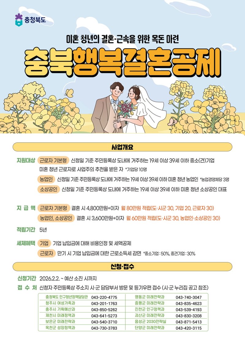 '충북행복결혼공제'는 도내 미혼인 중소(중견)기업 청년 근로자와 청년 농업인, 소상공인의 목돈 마련을 지원하는 사업이다. 청년층 결혼 장려로 출생률 제고에 기여함과 동시에 기업 장기근속을 유도하고 청년 농업인·소상공인의 복지 증진을 도모하는 데 목적이 있다.
