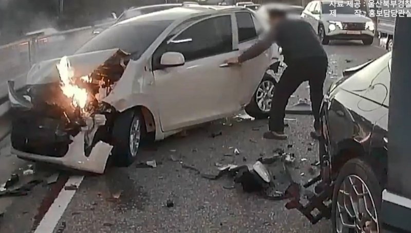 5일 울산경찰청에 따르면 지난달 7일 오후 5시31분께 울산 북구 강동번영로에서 경주 방면으로 달리던 모닝 차량이 차량 3대를 잇따라 들이 받았다. 이 사고로 모닝 차량 전면부에서 불길이 치솟았다.