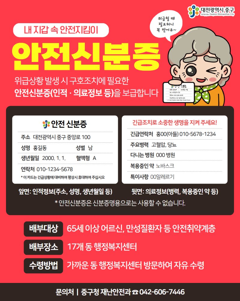 65세 이상 어르신과 만성질환자 등 안전취약계층을 대상으로 배부한다. 성명, 주소, 생년월일 등 기본 인적사항과 병력 및 복용중인 약 등 의료정보가 기재된다.