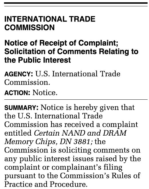 5일 업계에 따르면 미국 국제무역위원회(ITC)는 미국계 특허관리전문회사(NPE)인 모노리식 3D(Monolithic 3D)가 접수한 민원을 미국 연방관보에 게재하고, 해당 사안에 대한 의견 제출 절차를 진행 중이다.