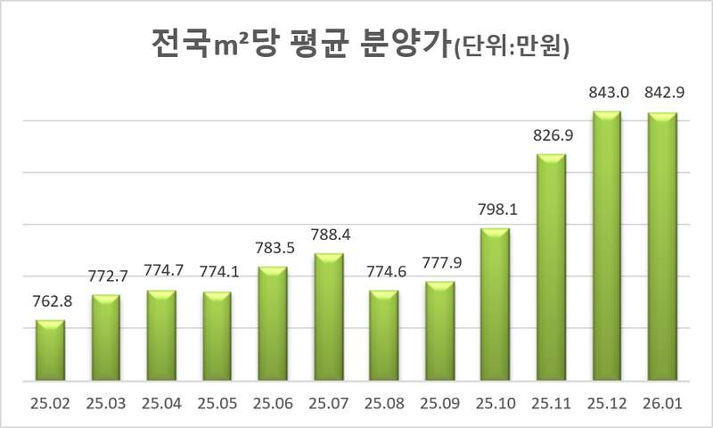 전용 84㎡ 분양가도 비슷한 움직임을 보였다. 1월 전국 전용 84㎡ 평균 분양가는 7억770만 원으로 2025년 9월 이후 5개월 만에 하락 전환했다. 2025년 9월 6억5952만원에서 12월 7억1308만 원으로 3개월 만에 5천만원 이상 상승했으나, 1월 들어 7억770만 원으로 조정됐다.