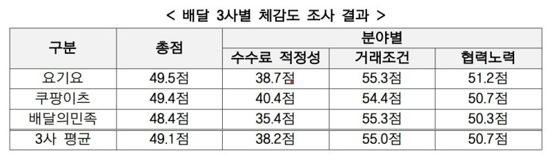 중소벤처기업부와 동반성장위원회가 5일 발표한 '2025년 배달3사 체감도 조사' 결과에 따르면 배달앱 3사의 평균 체감도 점수는 49.1점으로, 동반성장지수 평가 대상 대기업의 평균 점수 73.47점에 크게 못 미쳤다.