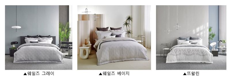 신제품 ‘웨일즈’는 너도밤나무 추출 원료인 모달 70%와 면 30%를 혼방한 침구로 자연 소재의 흡수력과 통기성을 살려 체온과 습도를 조절하는 기능을 강화했다. 겹겹이 쌓아 올린 듯한 자연의 질감을 표현한 패턴이 특징이다.