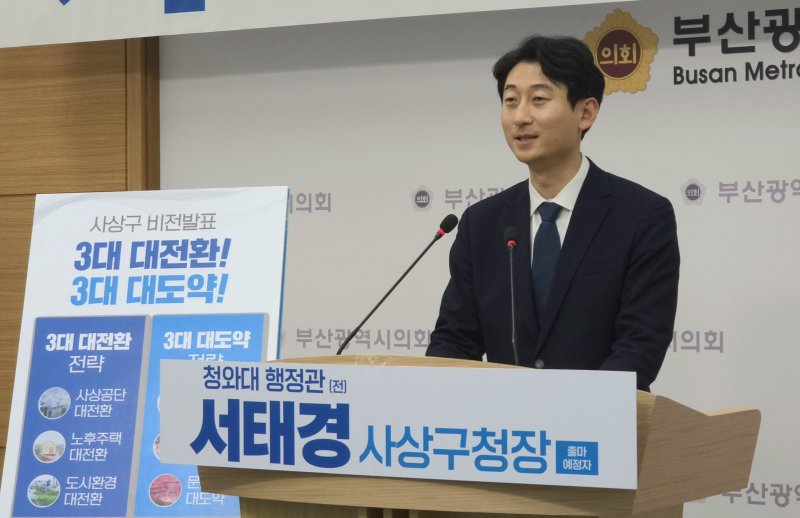 (부산=뉴스1) 이주현 기자 = 부산 사상구청장 출마 의사를 밝힌 더불어민주당 소속 서태경 전 청와대 행정관이 5일 시의회 브리핑룸에서 기자회견을 열고, 노후 공업도시인 사상에 대대적인 변화가 필요하다며 선거 비전을 발표했다.