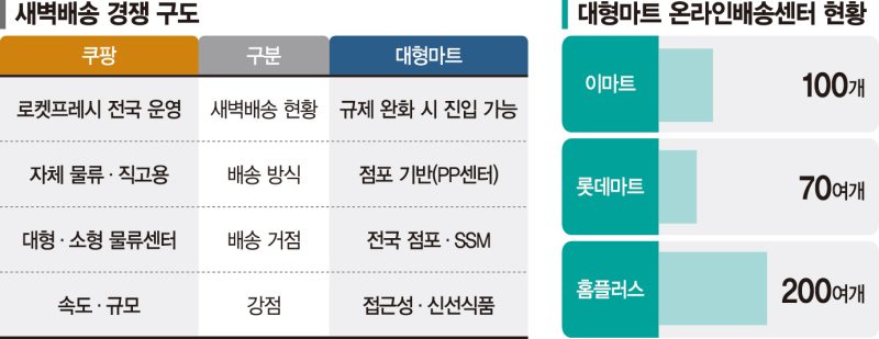 지난해 대규모 개인정보 유출로 불거진 이른바 '쿠팡 사태'를 계기로 플랫폼 규제와 오프라인 유통 지원을 병행해야 한다는 문제의식이 확산되면서 정치권이 그간 손대지 못했던 '규제 대못'을 해소하려는 기류가 강해지고 있다. 대형마트가 새벽 배송 경쟁에 합류하면 쿠팡이 주도해 온 시장에 대형마트와 네이버 쇼핑이 가세한 '3파전' 구도가 형성될 수 있다는 관측도 나온다.