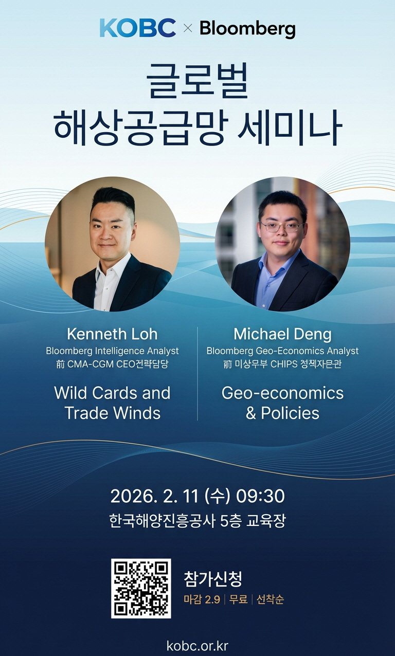 첫 세션에서는 블룸버그 인텔리전스 분석가 케네스 로가 연사로 나선다. 국제 해운사 CMA-CGM에서 전략 매니저를 담당한 그는 풍부한 실무 경험을 바탕으로, 해운시장의 불확실성 속에서 나타나는 주요 위험과 기회요인을 분석할 예정이다. 이어 미국 상무부 반도체 CHIPS 정책 자문관 출신인 블룸버그 지정학 경제(지오이코노믹스) 분석가 마이클 덩이 강연을 맡는다. 그는 국제 지정학과 산업 정책 변화가 해상 공급망과 관련 산업 전반에 미치는 영향을 심도 있게 조명할 계획이다.