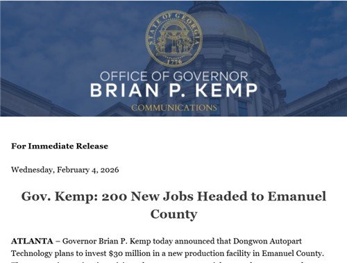 주 경제개발부 팻 윌슨 장관은 "동원금속의 두 번째 조지아 공장 설립은 주내(州內) 자동차 산업이 꾸준히 성장하고 있다는 증거"라고 말했다.