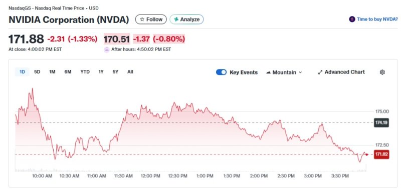 5일(현지 시각) 뉴욕증시에서 엔비디아는 1.33% 하락한 171.88달러를 기록했다. 이로써 시총도 4조1850억달러로 줄었다.