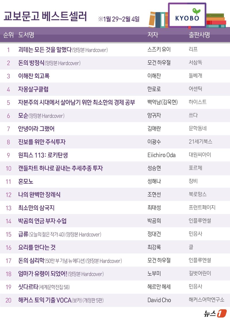 이광수의 '진보를 위한 주식투자'는 8위, 만화 '원피스 113: 로키탄생'은 9위에 각각 자리했다.