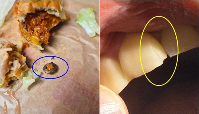 그는 "퇴근 후 배가 고파 햄버거를 먹다가 갑자기 딱딱한 금속이 씹혔고, 그 순간 이가 부서졌다"며 햄버거에서 나온 금속과 충격으로 인해 깨진 앞니 사진을 공개했다.