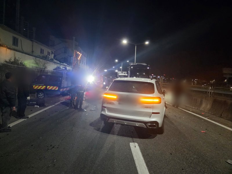 (부산=뉴스1) 장광일 기자 = 6일 오전 4시 25분쯤 부산 금정구 금사동 번영로 금사램프 부근에서 스포츠유틸리티차량(SUV)이 교통 정체를 알리던 1톤짜리 사인카를 뒤에서 들이받는 사고가 났다.
