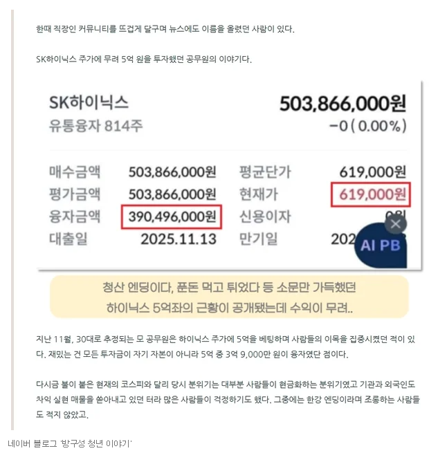 A씨는 최근 본인의 블로그를 통해 "지난 11월 30대로 추정되는 공무원 B씨는 하이닉스 주가에 5억원을 베팅하며 사람들의 이목을 집중시켰던 적이 있다"며 "재미있는 건 모든 투자금이 자기 자본이 아니라 5억원 중 3억9000만원이 융자였다는 점"이라고 한 투자 사례를 언급했다.