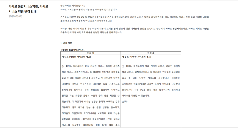 카카오 관계자는 "이용자 불안 해소를 위해 약관을 재개정했다"며 "초기 약관 개정 취지 대로 인공지능기본법에 따른 투명성 강화 조항은 유지하고, 이용자들의 오해와 우려가 발생한 부분을 삭제했다"고 설명했다.