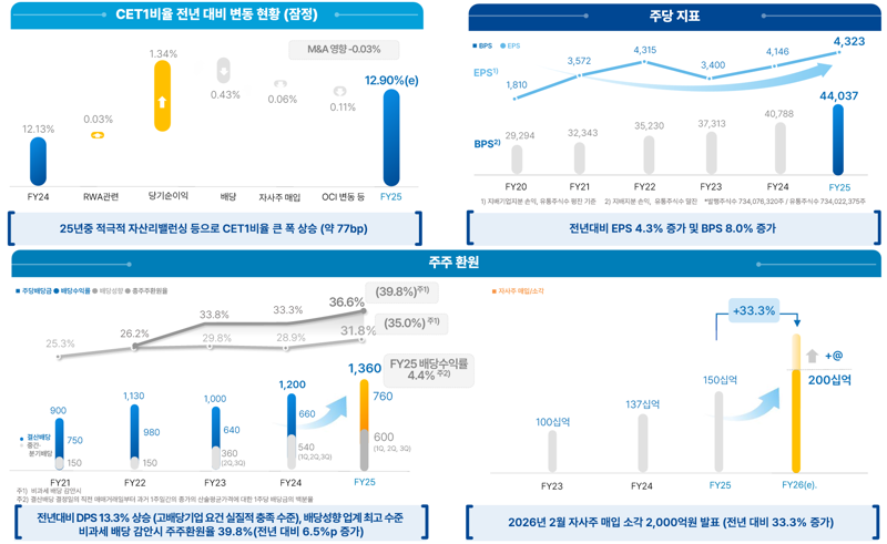 우리금융은 보통주자본비율을 전년 대비 약 80bp 개선된 12.9%로 집계됐다. 앞서 우리금융은 2025년 목표치를 12.5%로 잡았는데 추가 달성한 것이다. 우리금융은 "지난 4·4분기 급격한 환율 상승 등 녹록지 않은 금융환경 속에서도 전사적인 위험가중자산 관리 노력이 빛을 발한 결과"라며 "올해 보통주자본비율 13% 조기 달성 및 안정적 유지를 최우선 목표로 삼고 우량자산 중심의 자산 리밸런싱 지속과 유휴부동산 매각 등 소유부동산의 효율적 관리를 통해 그룹 재무구조를 한층 개선할 계획"이라고 밝혔다. 이를 바탕으로 증권·보험 등 신규 자회사의 경쟁력 강화와 그룹 시너지 극대화로 지속가능 성장기반을 더욱 체계적으로 구축한다는 구상이다.