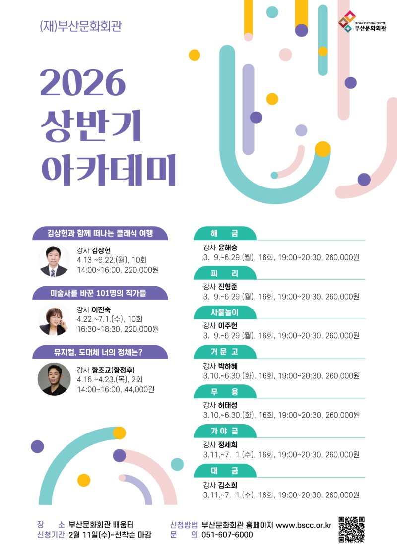 수강 신청은 2월11일 오후 2시부터 가능하며, 강좌 일정과 세부 내용은 부산문화회관 홈페이지 또는 전화 문의를 통해 확인할 수 있다.