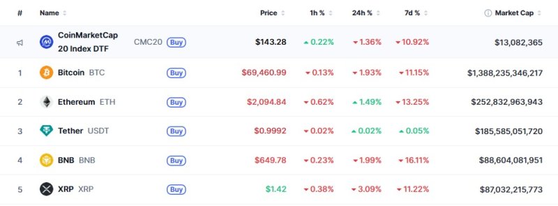 8일 오전 7시 30분 현재 글로벌 코인 시황 중계사이트 코인마켓캡에서 비트코인은 24시간 전보다 1.93% 하락한 6만9460달러를 기록하고 있다. 이날 비트코인은 최고 7만1681달러, 최저 6만7364달러 사이에서 거래되고 있다.