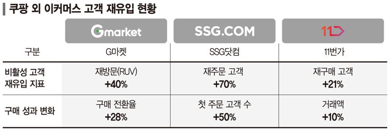 11번가도 비활성 고객과 신규 고객 모두 늘고 있다. 11번가에 따르면 13개월 이상 구매 이력이 없던 고객 가운데 지난해 12월과 올해 1월에 다시 구매한 고객 수는 전년 동기 대비 21% 증가했다. 해당 고객들의 거래액도 10% 늘었다. 같은 기간 신규 가입 후 첫 구매를 한 고객 수는 27% 증가했으며, 거래액 역시 8% 확대됐다.