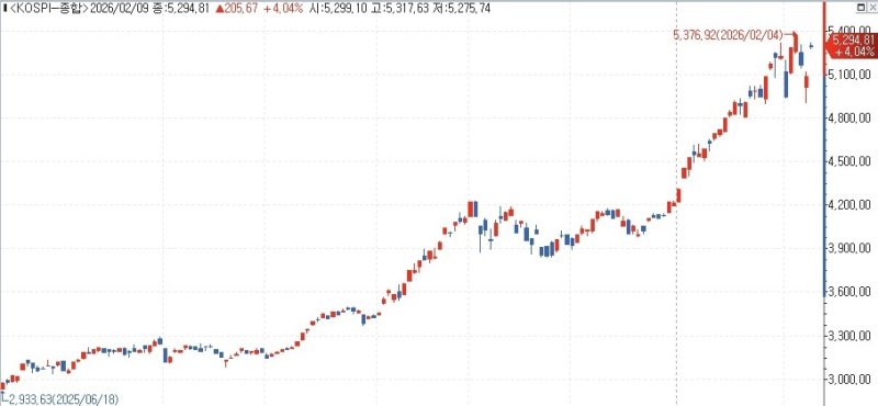 이날 오후 1시 25분 기준 코스피는 전장보다 3.83% 오른 5283.92를 기록하고 있다. 지수는 전 거래일보다 4.13% 오른 5299.10으로 출발해 장 초반 5322.35(4.58%)까지 올랐다.
