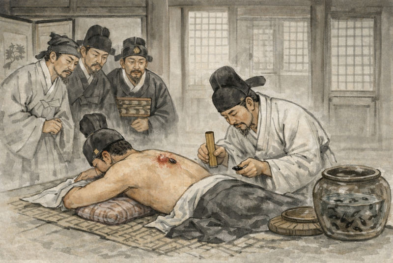 의관은 다시 “전하, 작년 초여름에 시술했던 거머리침이 효과가 컸사옵니다. 다시 한번 거머리침을 놓는 것을 윤허하여 주시옵소서.”라고 했다.