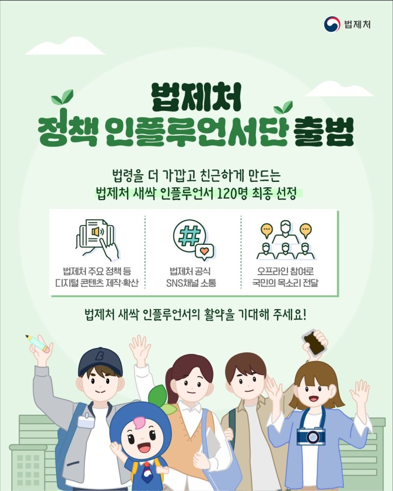이번에 출범한 정책 인플루언서단은 대학생 및 청년 등 120명으로 구성됐다. 이들은 올해 12월까지 주요 정책과 법령 정보를 디지털 콘텐츠로 제작해 법제처 공식 SNS채널에서 소통 전달하는 활동을 한다.