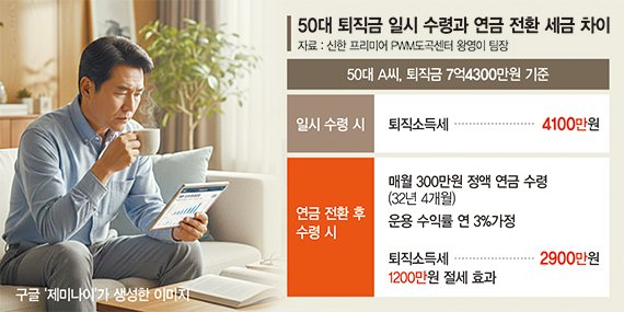 특히 A씨처럼 명예퇴직금이 포함된 사례라면 일시 수령보다는 연금 전환을 고려해야 한다. 명예퇴직금은 수령 후 60일 이내에 과세이연 신청을 하면 IRP 계좌로 전액 또는 일부 이체를 통해 연금 전환이 가능하다.