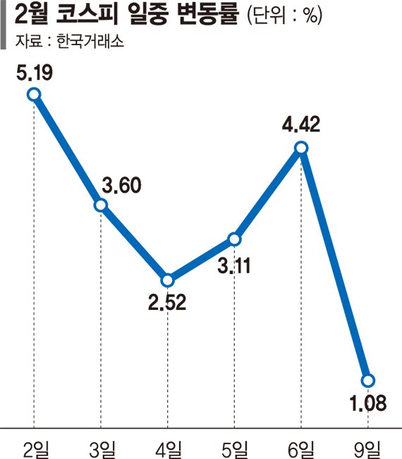 9일 한국거래소에 따르면 이달 들어 이날까지 코스피 일중 변동률은 평균 3.32%로 집계됐다. 코로나19 영향으로 변동성이 컸던 지난 2020년 3월 4.27% 이후 최고치이다. 전월 2.06%은 물론, 지난해 변동성이 가장 컸던 11월 2.41%과 비교해도 높은 수준이다.