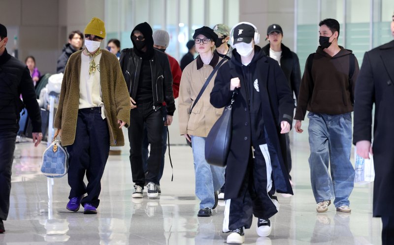 멤버들은 장시간 비행에도 피곤한 기색 없이 공항에 모인 팬들과 기자들을 향해 반갑게 인사한 뒤 빠른 걸음으로 입국장을 빠져나갔다.
