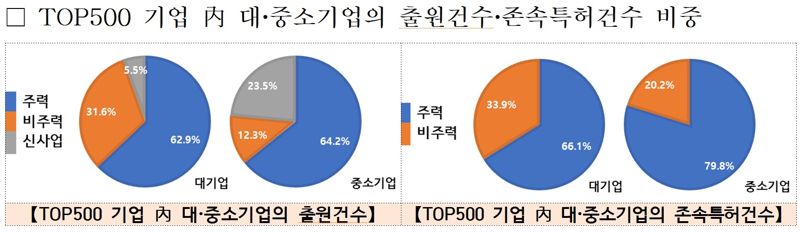 분석결과, 특허출원 톱 500 기업의 12.5%를 차지하는 중소기업의 존속특허는 해당기업의 주력 사업분야와 79.8%가 일치했다. 이는 중소기업이 기업역량을 주력 사업분야에 집중하고 있다는 것을 의미한다.