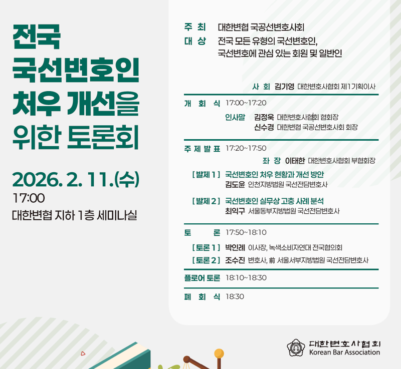 10일 변협은 오는 11일 오후 5시 변협 지하 1층 세미나실에서 국공선변호사회 주관으로 '전국 국선변호인 처우 개선을 위한 토론회'를 개최한다고 밝혔다