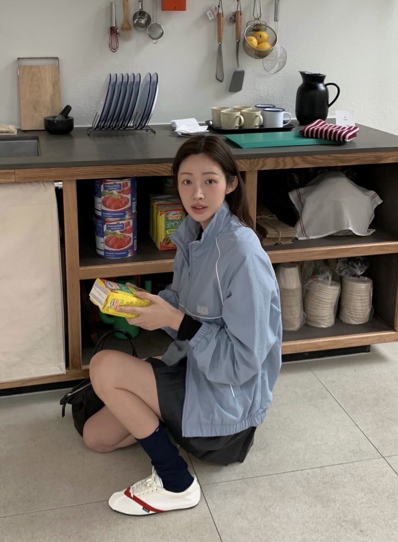 차정원은 광고 제품인 바람막이를 입고 있다.
