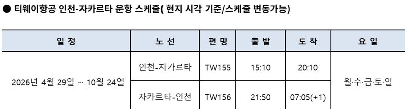 티웨이항공 인천-자카르타 노선은 4월 29일부터 주 5회(월·수·금·토·일) 일정이다. A330-300(347석-비즈니스 12석, 이코노미 335석) 중대형 기종을 투입해 운항할 예정이다.