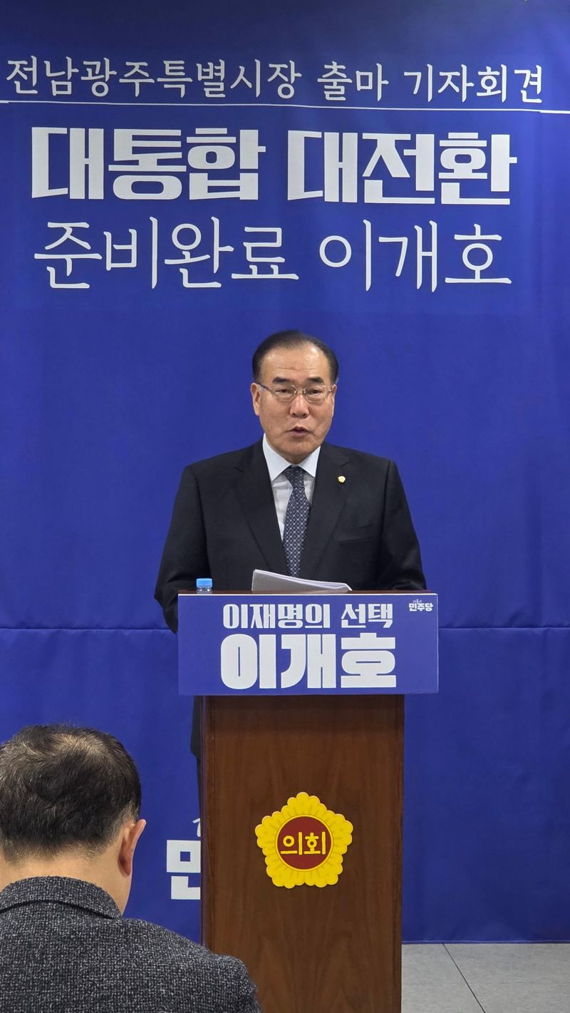 이개호 의원은 이날 출마선언문을 통해 "지방 주도 국가 균형 발전을 이끄는 남부권 시대를 반드시 열겠다는 사명감으로 이 자리에 섰다"면서 "광주의 혁신 역량과 전남의 잠재력을 하나로 묶어 수도권 일극주의에 대응하는 대한민국의 남부 수도를 건설하겠다"라고 밝혔다.