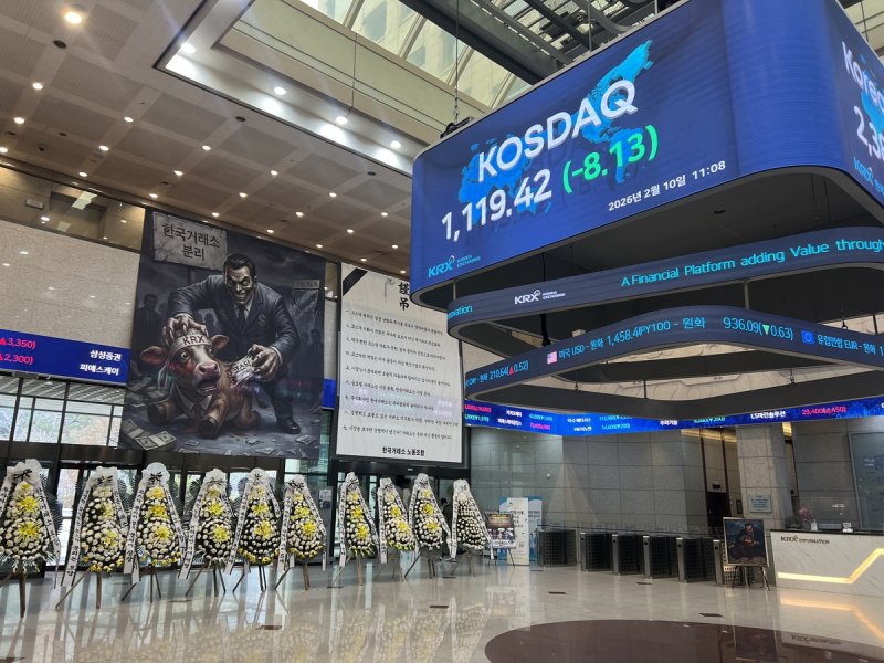 거래소 로비에 근조화환…노조 "코스닥 분리는 투기판 제도화"정치권 '코스닥 분리' 추진에 반발…"시장 통합 글로벌 추세에 역행"
