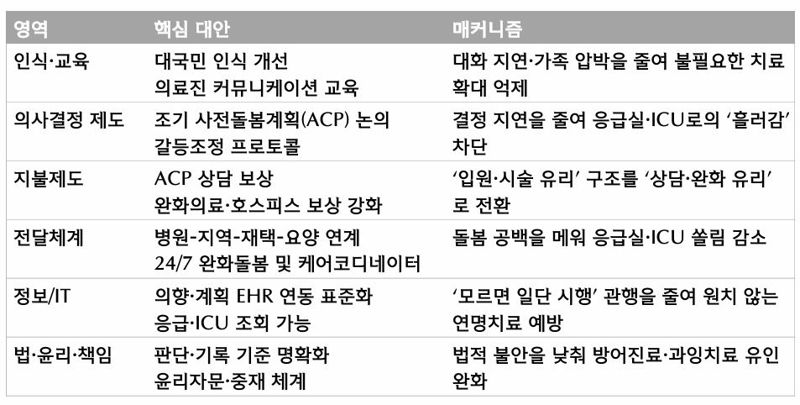 이에 박 교수는 해당 6개 영역에 대해 △대국민 인식 개선, 의료진 커뮤니케이션 교육 △조기 사전돌봄계획(ACP) 논의, 갈등조정 프로토콜 △ACP 상담 보상, 완화의료·호스피스 보상 강화 △병원-지역-재택-요양 연계, 완화돌봄 및 케어코디네이터 △의향·계획 전자의무기록(EHR) 연동 표준화, 응급·ICU 조회 가능 △판단·기록 기준 명확화, 윤리자문·중재 체계 등을 대책으로 제시했다.