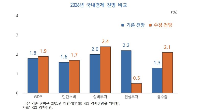 [파이낸셜뉴스]한국개발연구원(KDI)가 올해 경제성장률을 1.9%로 전망했다. 지난해 11월 1.8% 보다 0.1%p 올렸다. 글로벌 인공지능(AI) 기대감에 반도체 수출이 활황이고 민간소비가 회복세기 때문이다. 다만, 지방 부동산 경기 위축에 따라 건설투자 지표를 대폭 내려잡았다. 미국 관세정책과 물가상승률도 성장률 발목을 잡을 리스크(위험요인)로 꼽으면서 정부 ‘2% 전망’이 위협 받는 모양새다.