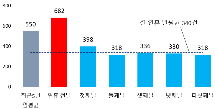 최근 5년(2020~2024년)간 설 연휴 기간 교통사고를 분석한 결과, 하루 평균 340건의 교통사고가 발생했다. 특히 연휴 시작 전날 교통사고가 평소 일평균 550건보다 약 1.2배 높은 682건으로 집계됐다. 사고는 오후 2시부터 저녁 8시 사이에 전체의 43.5%가 집중됐다. 가족 단위 차량 이동이 많아지면서 교통사고 건수는 평소보다 줄었으나, 사고 100건당 사상자 수는 172명으로 평소 145명보다 증가했다.