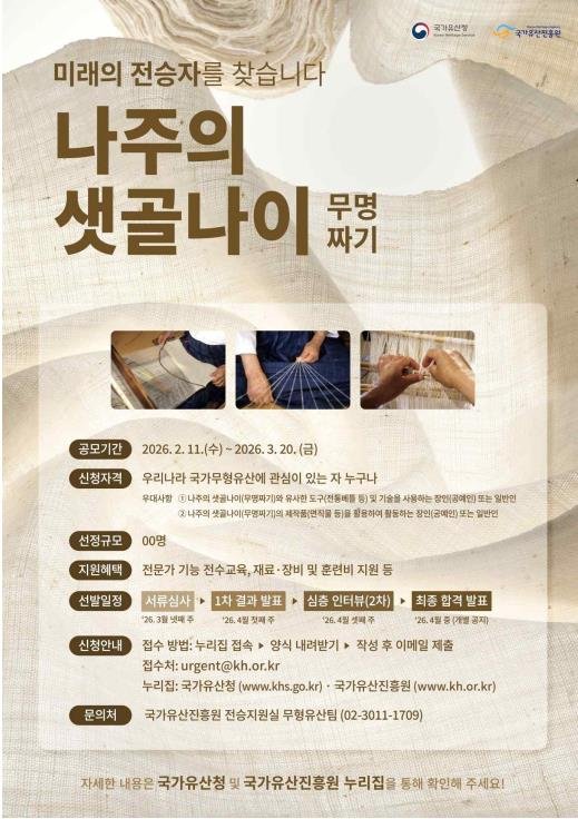 [파이낸셜뉴스] 국가유산청과 국가유산진흥원은 내달 20일까지 '나주의 샛골나이(무명짜기)' 전통을 이을 미래 전승자를 모집한다고 11일 밝혔다.