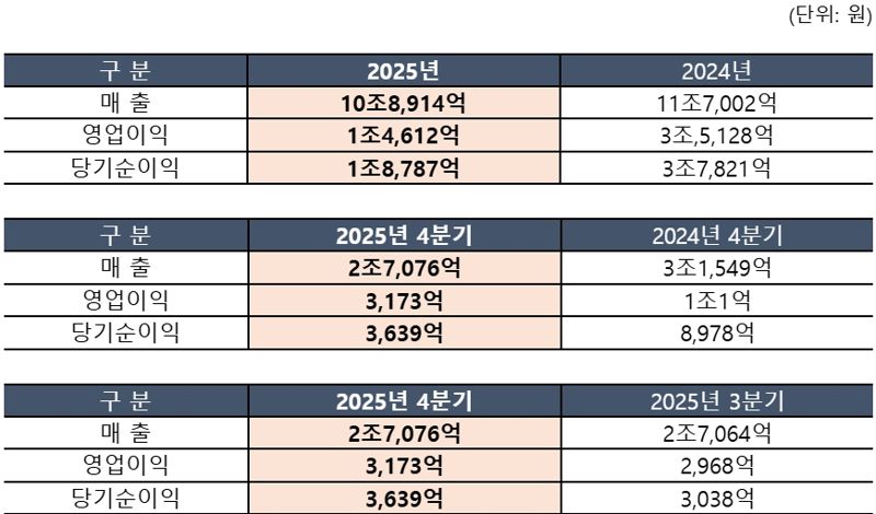 [파이낸셜뉴스] HMM은 2025년 매출 10조8914억원, 영업이익 1조4612억원, 당기순이익 1조8787억원을 기록했다고 11일 공시했다. 영업이익률은 13.4%로 해운시황 약세 속 견조한 수익성을 유지했지만, 2024년 영업이익 3조5128억원 대비로는 반토막도 안되는 수준이다.