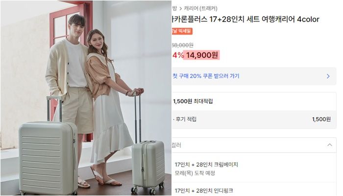 무신사는 지난 9일부터 오는 18일까지 설날 빅세일을 진행 중이다. 이에 트래커 측은 앞선 10일 정가 26만8000원짜리 '마카론플러스17+28인치 세트 여행캐리어 4color' 제품을 1만4900원에 판매했다. 할인율은 약 94%에 달했다. 파격 할인에 소비자들이 대거 몰렸고, 판매가 시작된 지 얼마 되지 않아 품절됐다.