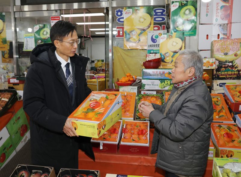 [파이낸셜뉴스] 김용선 지식재산처장(왼쪽)이 설 명절을 앞두고 대전 대덕구 중리시장을 찾아 온누리 상품권으로 명절 제수 용품을 구매하고 있다.