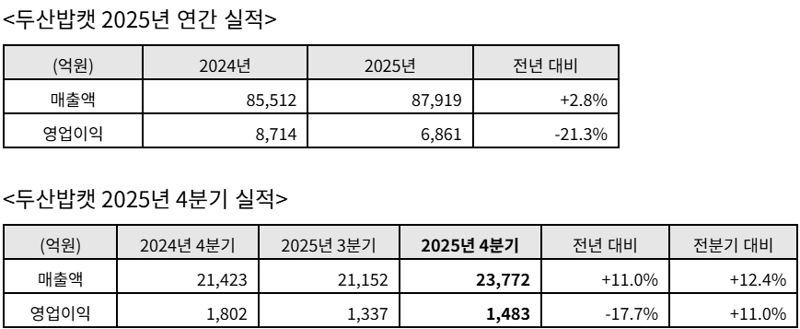 두산밥캣은 2026년 연간 전망으로 매출액은 전년대비 4.3% 성장한 64억5000만달러, 영업이익은 전년수준인 4억8200만달러를 제시했다.