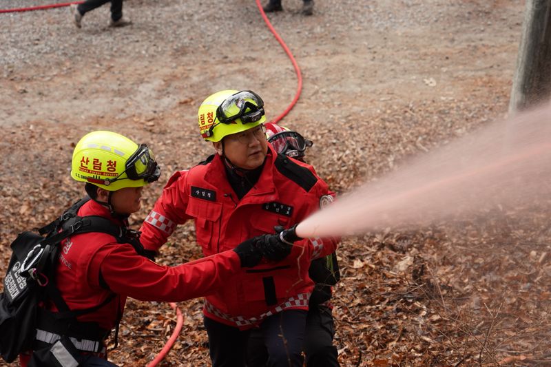 이날 김인호 산림청장은 세계문화유산인 영월 장릉에 직접 산불지연제를 예방 살포하는 훈련에 참여하며 산불 현장 대응 능력을 점검했다.