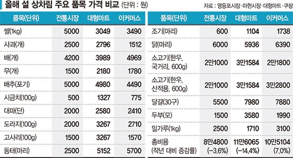 11일 본지가 설을 일주일 앞두고 16개 차례상 품목의 가격을 조사한 결과에 따르면 지난해 설 대비 전통시장과 대형마트의 평균 장보기 비용은 각각 3.6%, 14.4% 낮았다. 반면, 이커머스는 지난해 설보다 7.0% 상승했다.