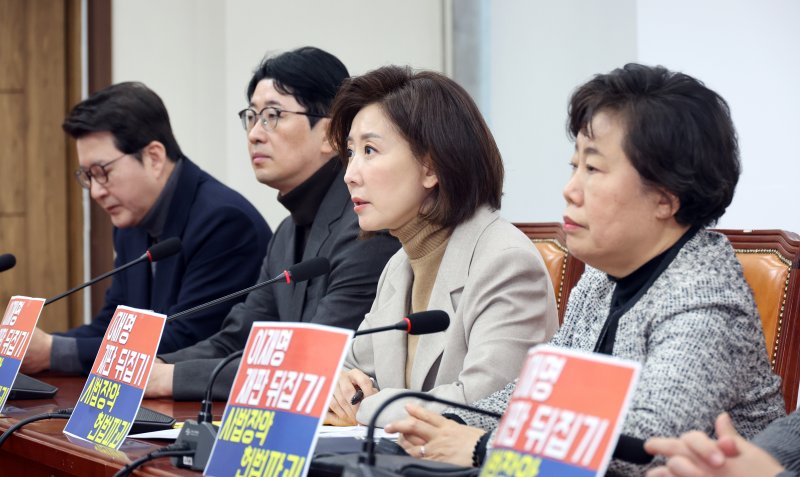 국민의힘 법사위원인 나경원·곽규택·조배숙·주진우 의원은 이날 오전 국회에서 기자간담회를 열고 "엊그제 대통령이 입법 속도가 늦다고 운운하니 어제 군사작전 하듯이 두 가지법, 대법관 증원법과 4심제법을 통과시켰다"고 말했다.